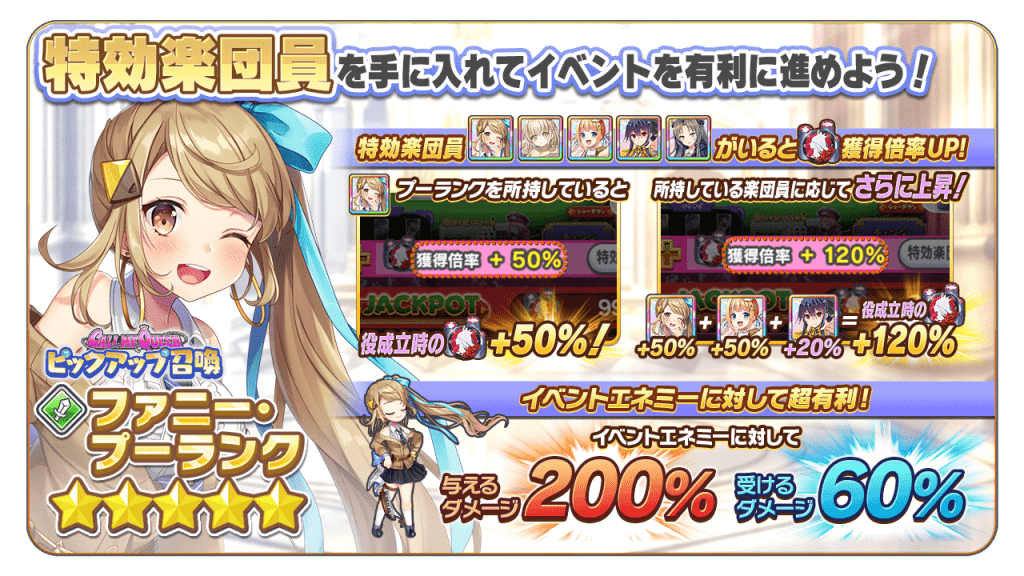 また、同一の特効楽団員を複数体所持していた場合でも、効果は1体分のみとなりますのでご注意ください。