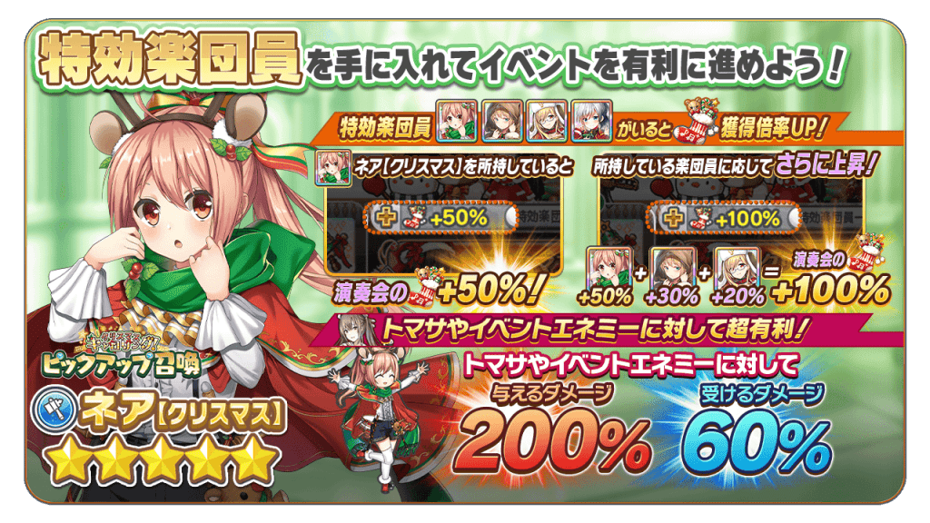 「クリスマスキャロリング! ピックアップ召喚」にて登場中の新楽団員「ネア【クリスマス】」をはじめとした特効楽団員をGETして、「サンタの靴下」の大量獲得を目指しましょう!