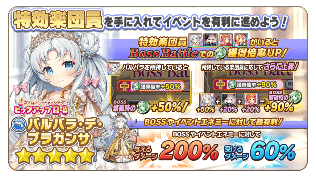 本イベントで特別な力を発揮する「特効楽団員」を所持していると、「Boss Battle」で獲得できる「アレッサメダル」が大幅に上昇します。