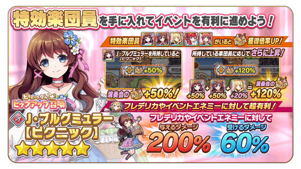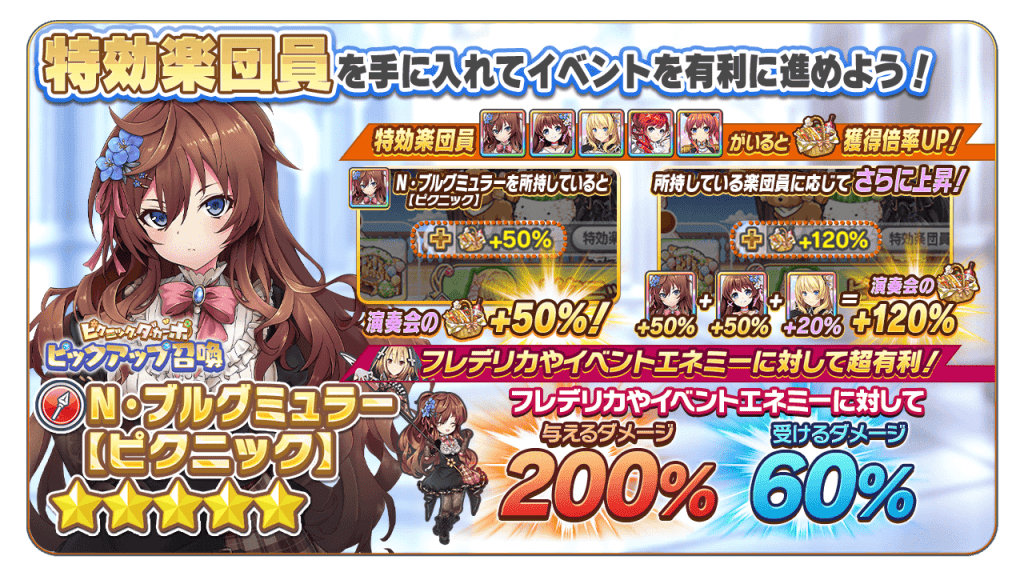 パワーアップした「ピクニック・ダ・カーポ」を遊び尽くして、★4楽団員「ブクステフーデ【ピクニック】」を含む豪華報酬を手に入れましょう。