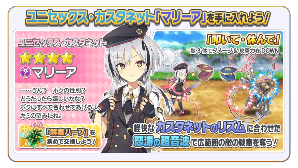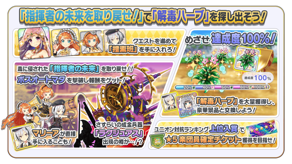「解毒ハーブ」を集めると、新楽団員「マリーア」含む豪華報酬を獲得できます!