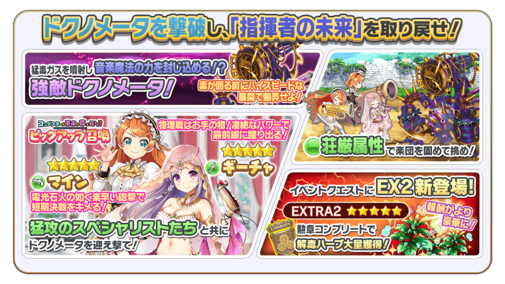 イベントボス「ドクノメータ」は猛毒ガスを駆使し、楽団員の音楽魔法の力を弱めてきます…!有利属性の【荘厳】属性を編成して挑みましょう!