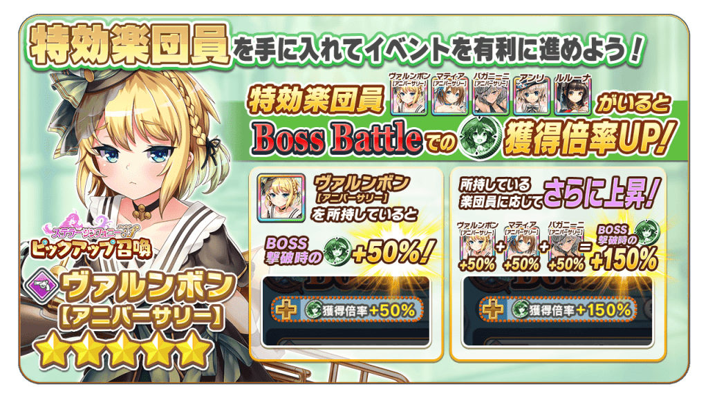 本イベントで特別な力を発揮する「特効楽団員」を所持していると、「Boss Battle」で獲得できる「ステラメダル」が大幅に上昇します。