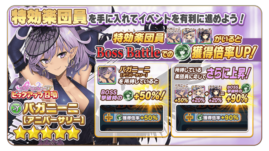 本イベントで特別な力を発揮する「特効楽団員」を所持していると、「Boss Battle」で獲得できる「ステラメダル」が大幅に上昇します。