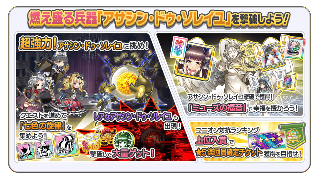 イベントクエストで獲得した「七色の旋律」を使うと、獲得できる「獲得宝箱」が2倍になったり、アサシン・ドゥ・ソレイユに大ダメージを与えられたりなど、「アサシン・ドゥ・ソレイユバトル」で様々な恩恵が受けられます♪