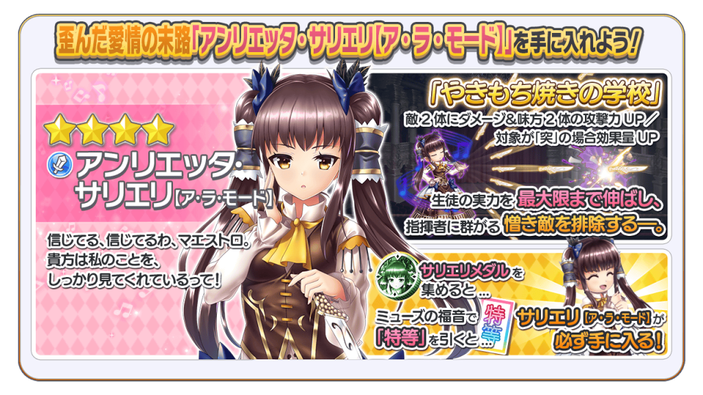 「サリエリメダル」は、新楽団員「アンリエッタ・サリエリ【ア・ラ・モード】」や豪華報酬と交換できます。