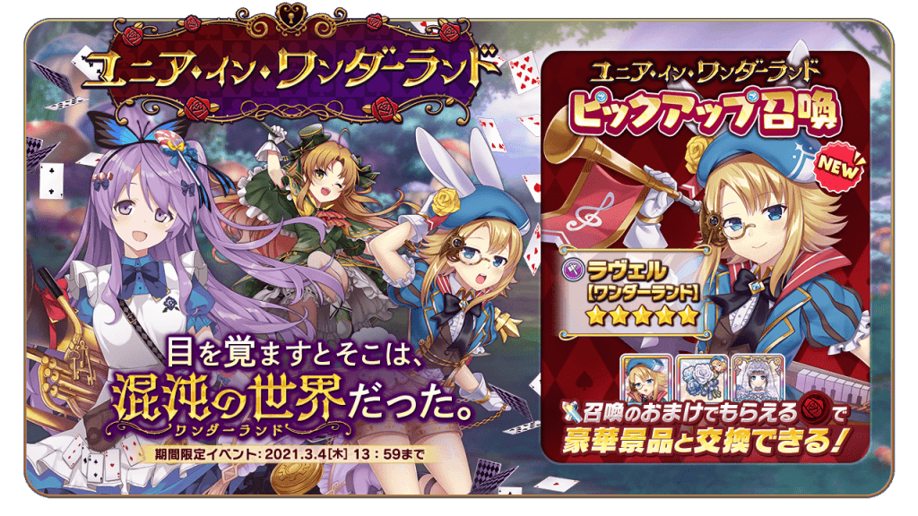 「ユニア・イン・ワンダーランド ピックアップ召喚」にて登場中の新楽団員「ラヴェル【ワンダーランド】」をはじめとした特効楽団員をGETして、「金色の鍵」の大量獲得を目指しましょう!