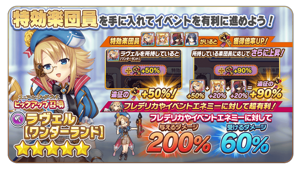 本イベントで特別な力を発揮する「特効楽団員」を所持していると、「ワンダーランドの大冒険」で獲得できる「金色の鍵」が大幅に上昇します。