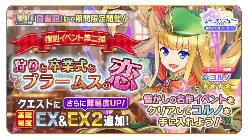 本日より、「ヴィエンナ音楽院」にて期間限定の復刻イベント「狩りと卒業式とブラームスの恋」を開催いたします。