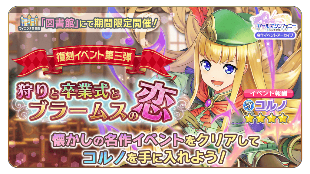 本日より、「ヴィエンナ音楽院」にて期間限定の復刻イベント「狩りと卒業式とブラームスの恋」を開催いたします。