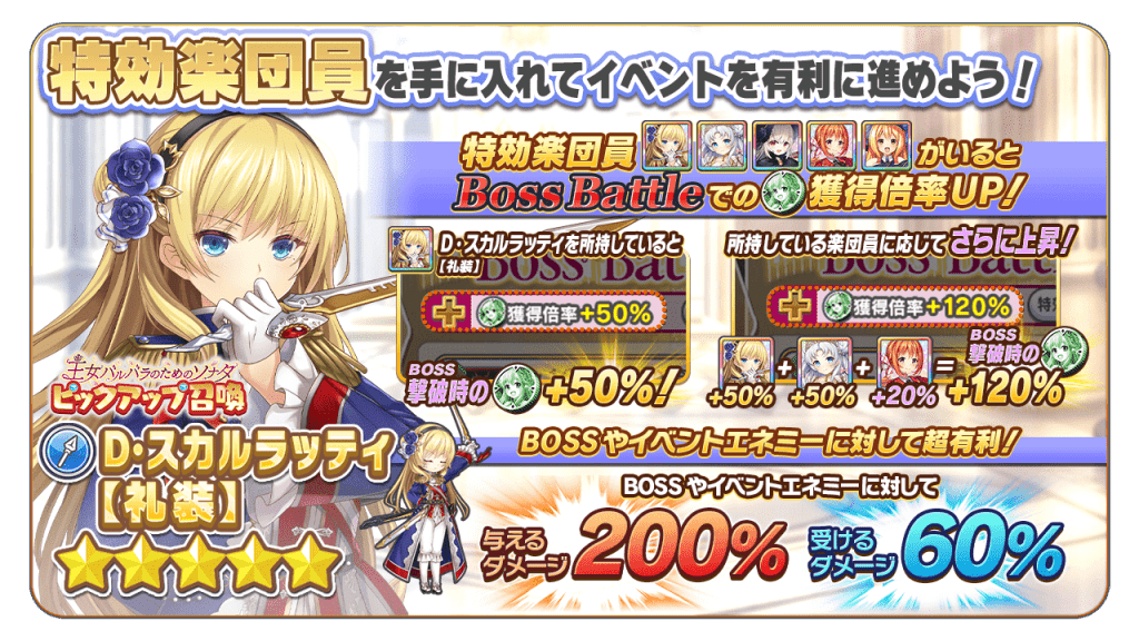 本イベントで特別な力を発揮する「特効楽団員」を所持していると、「Boss Battle」で獲得できる「アレッサメダル」が大幅に上昇します。