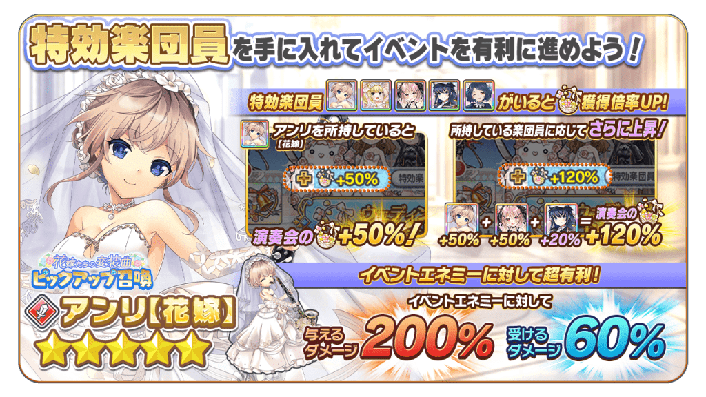 特効楽団員を編成すると、イベントボス「ハナヨメニンギョウ」含む全てのイベントクエストエネミーに対して、【与えるダメージUP】+【受けるダメージDOWN】の効果が付与され、イベントを有利に進めることができます。