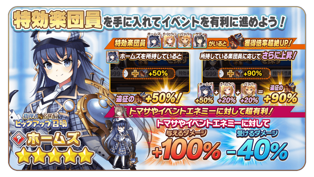 「指揮者VS名探偵 ピックアップ召喚」にて登場中の新楽団員「ワトソン」「ホームズ」をはじめとした特効楽団員をGETして、「盗まれた古楽器」の大量獲得を目指しましょう!