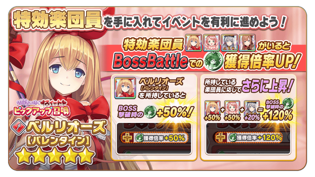 「指揮者に捧ぐスィート ピックアップ召喚」にて登場中の新楽団員「フラーラ【バレンタイン】」「ベルリオーズ【バレンタイン】」をはじめとした特効楽団員をGETして、「ビゼーメダル」の大量獲得を目指しましょう!