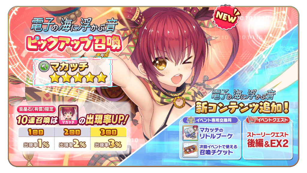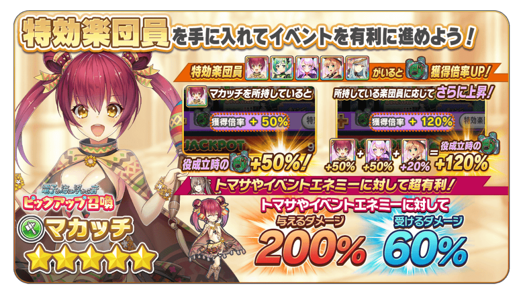 「電子の海に浮かぶ音 ピックアップ召喚」にて登場中の新楽団員「マカッチ」「テル:ミー」をはじめとした特効楽団員をGETして、報酬大量獲得を目指しましょう!